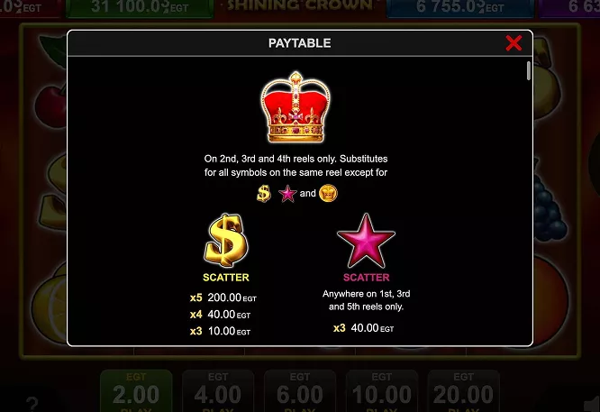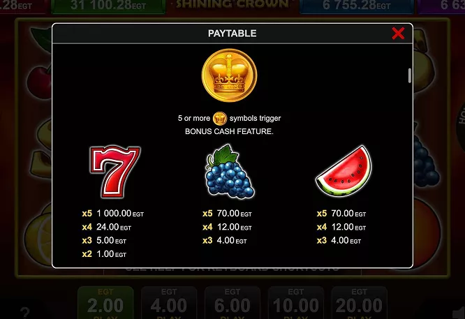 Discover all the essential details about Shining Crown by EGT (Amusnet). This section covers the game’s structure, symbols, RTP, volatility, and bonus features, giving you a clear overview before you start playing. Whether you prefer testing the demo or aiming for the progressive jackpot, these specs help you understand how the slot works and what makes it stand out among classic fruit machines.